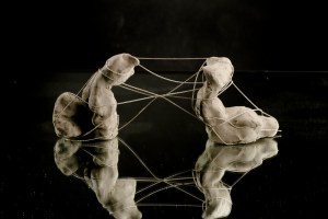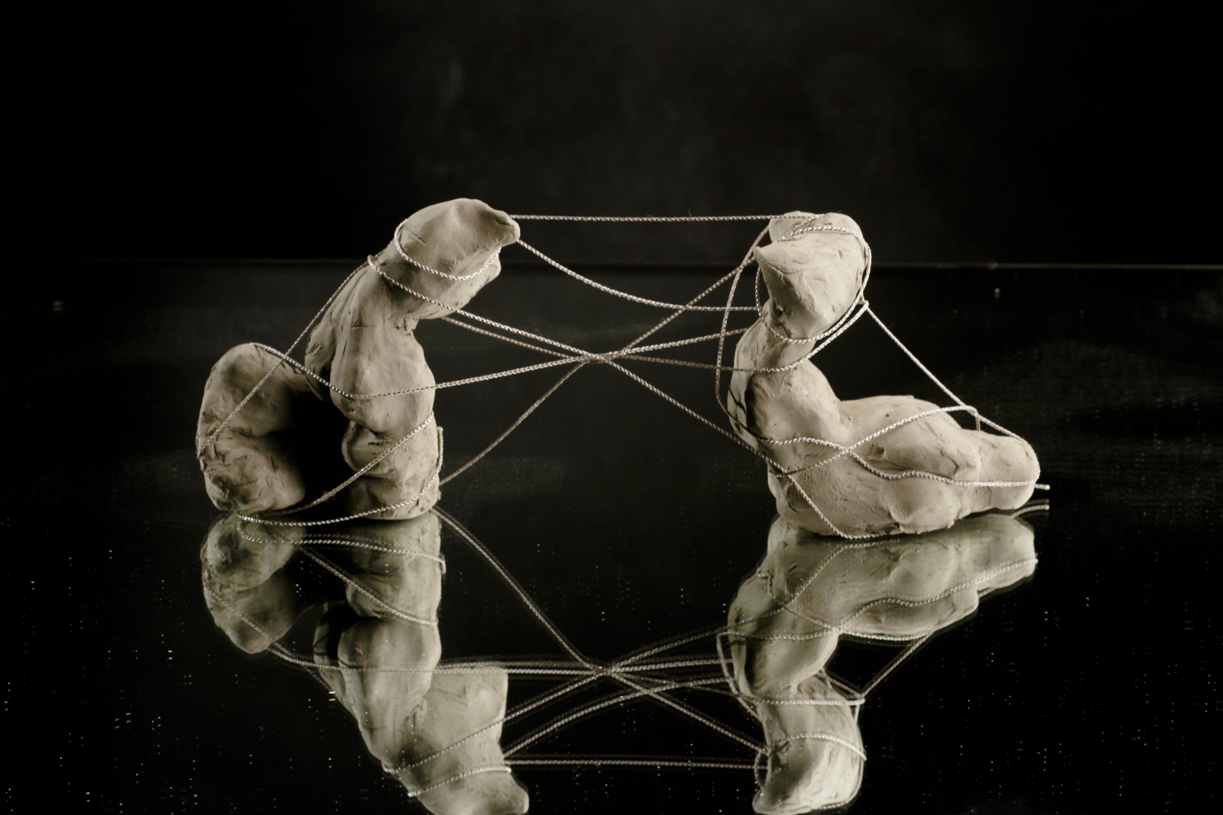 Sculpture of concrete and old engine oil with strings. on reflective surface.
