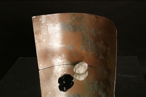 The concept of the materials are fixed to the emotional state one seeks to integrate with the raw and artificial aesthetics of concrete and the beauty and reflective property of used engine oil. While the sculptor evokes emotions during the process of the work, the final piece remains uninhabited, allowing constant empathy with the viewer.
