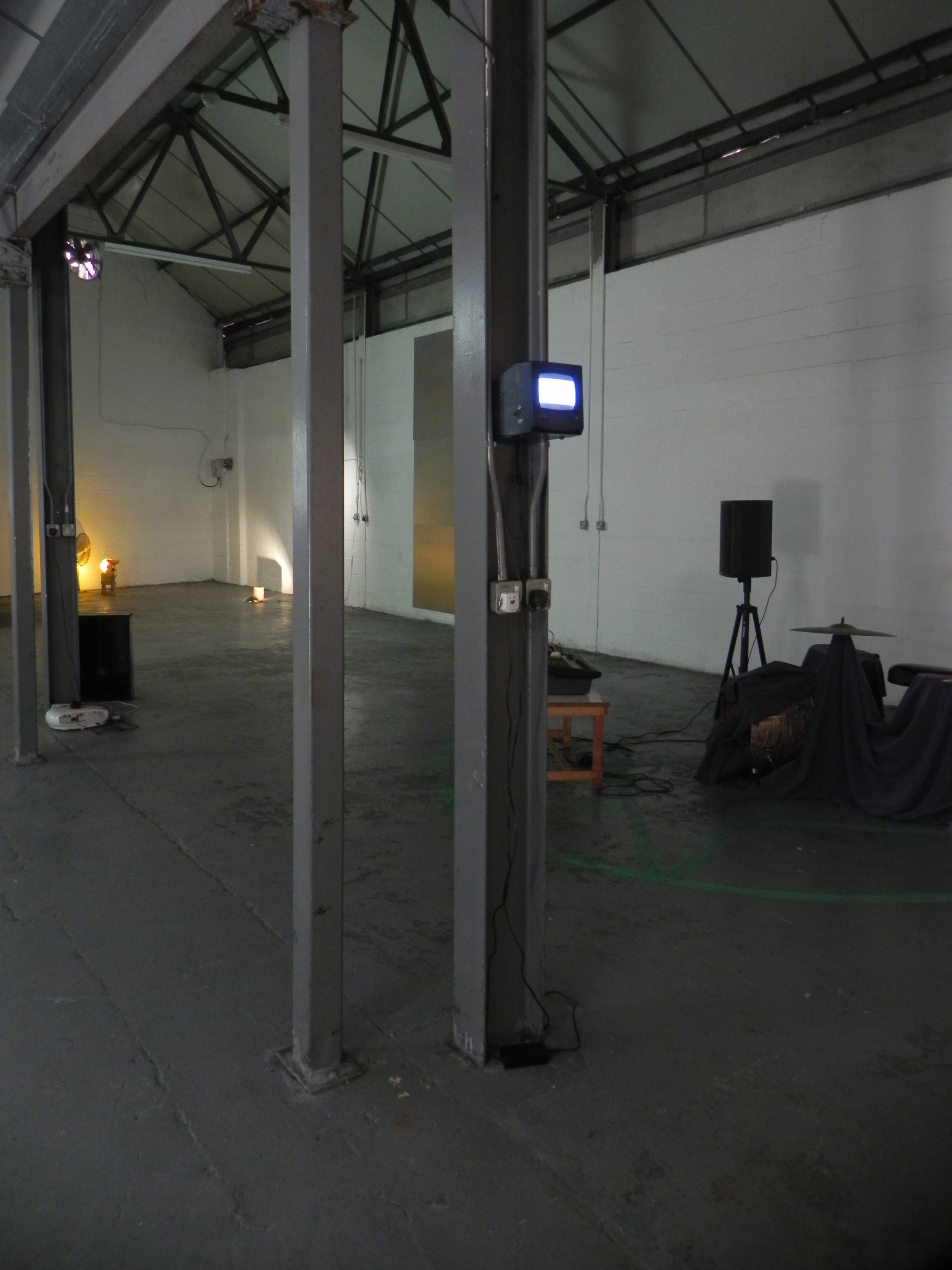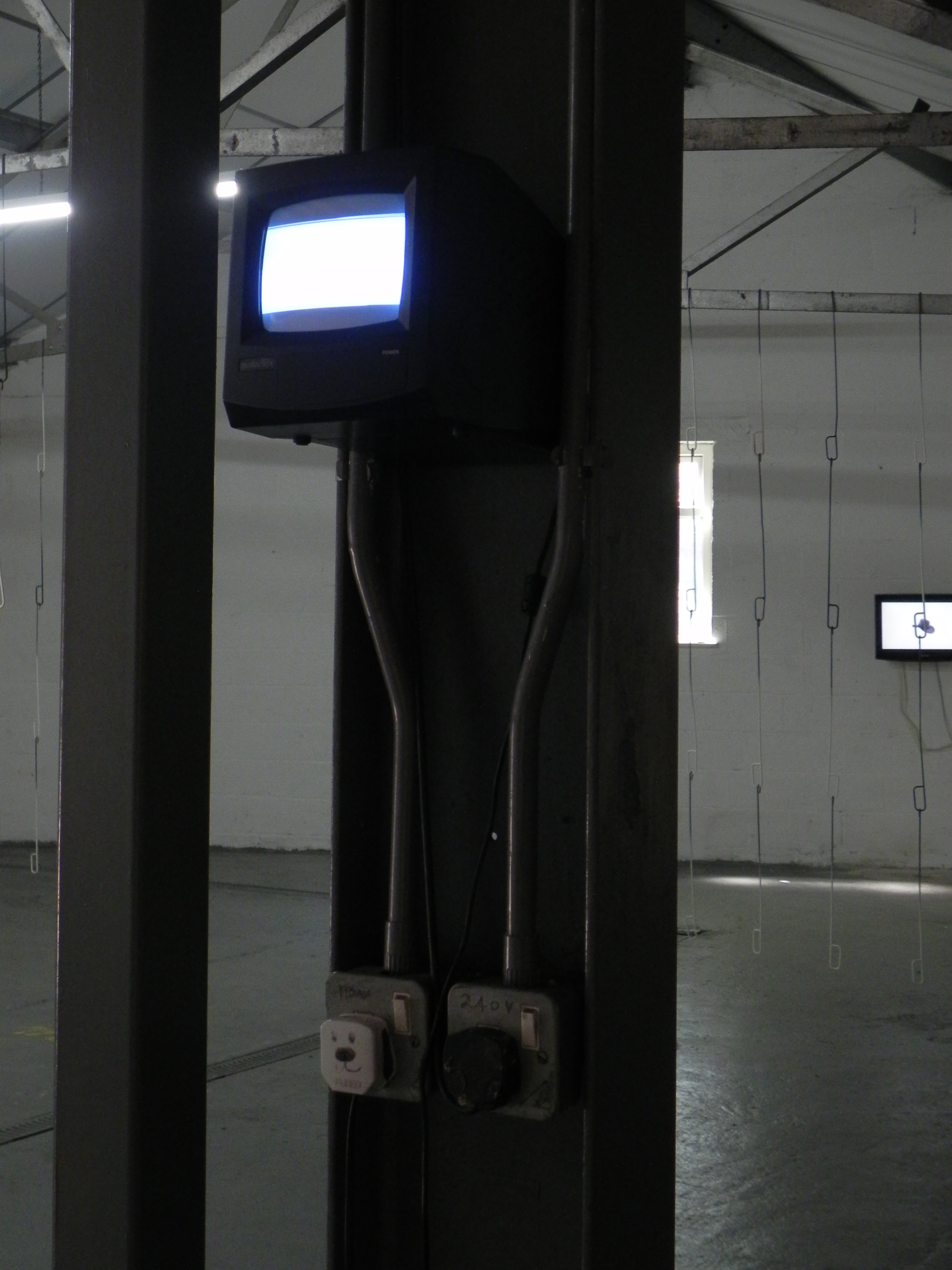 the reenactment of a line, 2018, cctv screen pressured into metal structural columns. Tape Modern exhibition, Food to the Dogs. www.tapemodern.org
