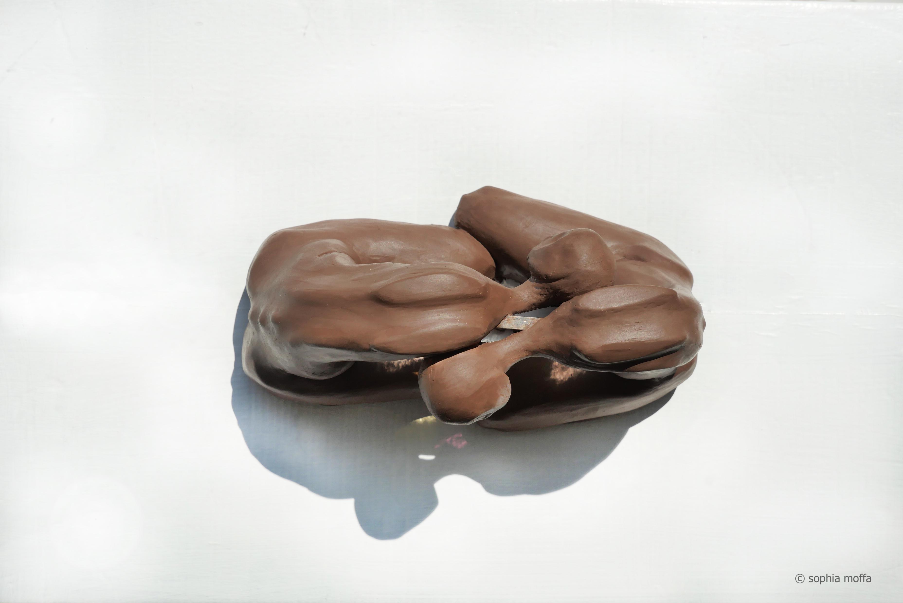 It may be a mother harbouring her child or he may be curved over contemplating his predicaments. But she could also be striding forward towards sacrifice of an unknown future. This work holds the strength and durability of a man made material, juxtaposed with the organic power of a living being. I wish to allow her to remain open to absorb the viewers subconscious feelings and connect to him as a living being, empathising with who ever stands to observe it.